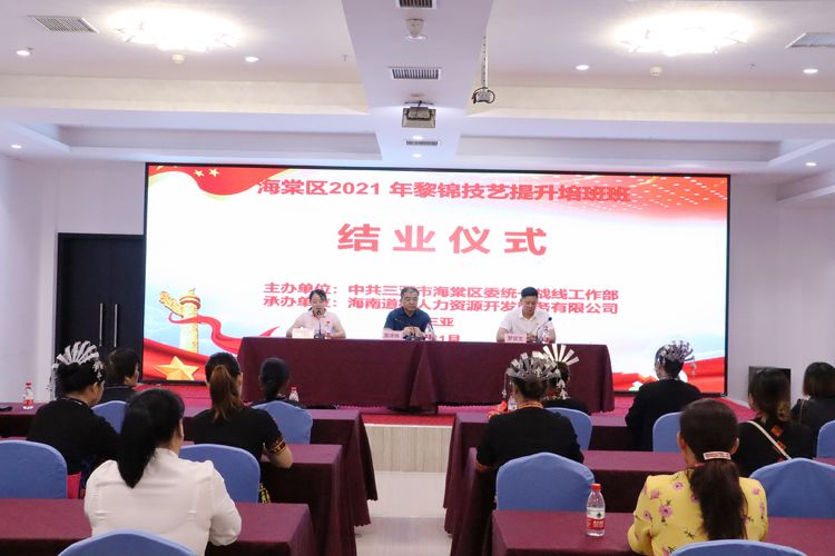 由中共三亞市海棠區(qū)委統(tǒng)一戰(zhàn)線工作部主辦,海南道格人力資源開發(fā)服務(wù)有限公司承辦的海棠區(qū)2021年黎錦技藝提升培訓(xùn)班,于2021年11月22日-26日在保亭戴斯溫泉酒店舉辦,中共三亞市海棠區(qū)委常委、統(tǒng)戰(zhàn)部部長黃澤緯同志做開班動員講話,參加培訓(xùn)的是海棠區(qū)各村(居)黎錦技藝愛好者,共計46人。