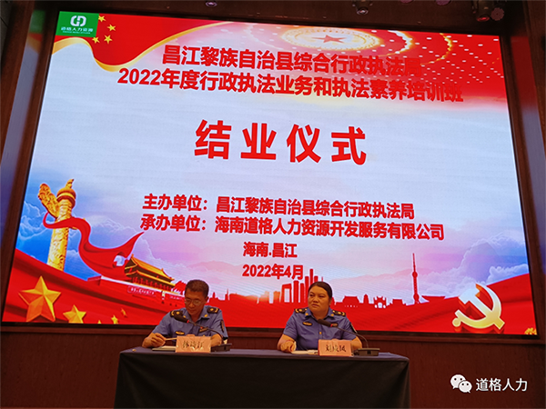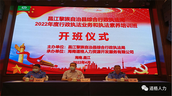 由昌江黎族自治縣綜合行政執(zhí)法局主辦,海南道格人力資源開發(fā)服務(wù)有限公司承辦的昌江縣綜合行政執(zhí)法局2022年度行政執(zhí)法業(yè)務(wù)和執(zhí)法素養(yǎng)培訓(xùn)班(第二期),于2022年4月26日在昌江棋子灣萬國海灘大酒店舉辦,此次培訓(xùn)為期4天。參加培訓(xùn)學(xué)員為昌江縣綜合行政執(zhí)法局工作人員,共計(jì)90余人。