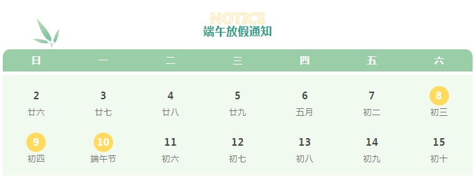 在2024年端午節(jié)來臨之際,根據(jù)《國務(wù)院辦公廳關(guān)于2024年部分節(jié)假日安排的通知》,結(jié)合公司實際工作情況, 假期為6月8日-10日端午節(jié)假期,6月10日(星期一)端午節(jié)當天放假,與周末相連,共3天,無需調(diào)休。